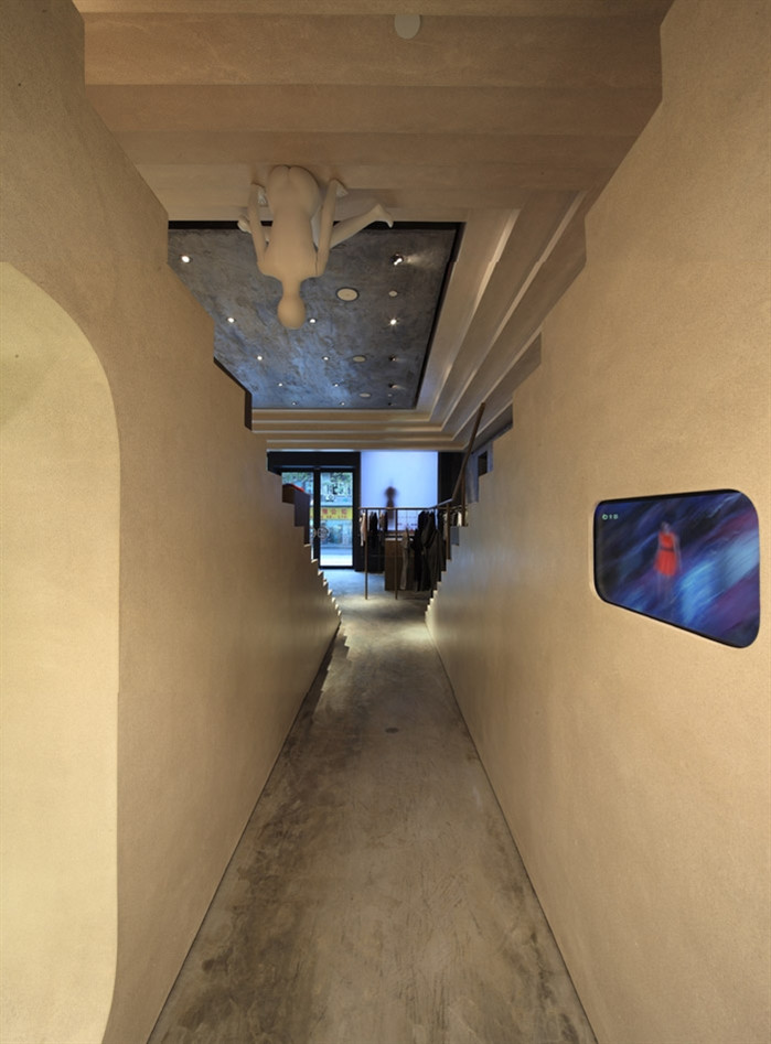凹凸前沿设计概念店位于中国上海商业繁华区的东方新天地,这里有过著名的石库门区改造案例,建筑多为两三层,在高楼毗邻的上海显得与众不同,体现了上海休闲的一面,新天地定位比较高端新潮,是吸引当地人和游客的好去处。概念店由Francesco Gatti设计,而这个店的主人是空姐出身的龙霄Sonja Long,她成功的转行入时尚界,她曾经在其它的采访中表示“我想创造一个成人游乐场,一个不只是购物的地方。”她是时尚界的专业买手,将欧洲那些在中国还不为人知的时髦潮流带到中国。在这个有限面积(100平米)的店里面,店主人希望:“不仅有衣服,还可以看到室内设计、工业设计,更多的东西”。设计师和店主的合作非常愉快,最后设计师创造了一个有力的连续的空间,从天花到地面蔓延这阶梯,家具不仅仅是家具,也是空间的一部分,并延续了视线。同时设计师剔除多余元素,保持设计的纯粹。一系列模特随着阶梯的走向放置,定义出不同的空间感,模特腿略弯曲,呈现出隐约含蓄的东方之美。从第一个设计开始,Francesco Gatti便一直采用混合异构解决方案,抓住空间本质,找到人和空间的精髓,定义空间,同时不掩盖空间的使用功能。在此概念店设计当中采用了最少的语汇。建筑师Francesco Gatti于2002年在罗马成立办公室,2004在上海开办分部办事处,其业务范围横跨建筑,艺术及室内社计。
