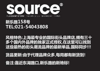 Source致力于把全世界最潮流的街头服饰引进上海,Source画廊将展示年轻的,由潜力的中国艺术家的作品,同时也将把国际的知名艺术家及其创作作品带到上海来.