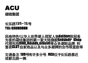 ACU以经营高端球鞋为主,也是中国第一家高端boutique sneaker店,由CLot-凝结集团的三位主力成员陈冠希Edison Chen、钟俊腱Tom Chung 、陈奂仁Hanjin倾力打造。陈冠希及其一班好友所主理的Clot是一个专为年轻人提供创新意念、强调个人独立思想及树立个人风格的年青创意单位。Clot 现在亦以成为了华语世界中街头文化的典型代表,也是全球街头文化网络中重要的一环.陈冠希的店铺ACU开业当天的盛况确实没让大家失望,Edison的CLOT Team,藤原浩、Futura、Stash、Eddie Cruz、仓石一树等潮流界的大师级人物都亲临了上海长乐路为ACU开张主持了剪彩仪式,一次过目睹了这么多位大师的风采绝对是不枉此行了。然而这还不过是个开端而已,不知上海的街头潮流文化能如Edison所说的那样,由鞋子开始,爆发成为一股强大的流行力量,再衍生到其他方面的服饰潮流,ACU到底有没有这样的潜力?先去看看他的波鞋店ACU吧!