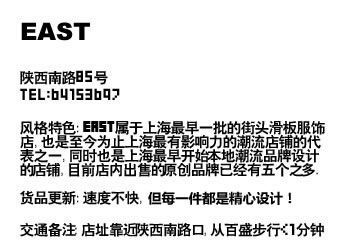 east最知名的牌子是INKY,实际上加上朋友做的,店里售卖的自有品牌有4-5个之多,east的牌子玩得都是当下或即将流行的元素,所以大部分都被台湾和香港的客户订走了,那边都不了解,以为是老外设计的,所以还有被抄袭的现象,可是本地的发售情况反而不好,因为国内的潮流文化刚起步,大家还处在比较倾向国外品牌的阶段,有点讽刺^_^