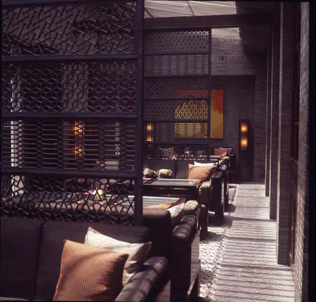 一楼靠窗的位置主要是Lounge和酒廊,顶上和隔断的玻璃,墙上的仿唐宋裸体仕女画和壁橱上的众多古董让传统与现代的元素在一个环境中协调共生。