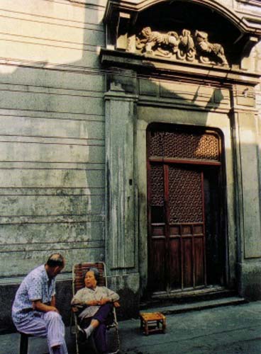 靖远街(Jingyuanjie)位于区境南部,即今百禄坊。上海开埠初期外轮海员往来频繁之地,当时有粤人开设的樟木箱店,奉化人制作西服的裁缝铺等,外国海员称此处为"中国老街"(Old