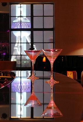 酒吧的装修充分利用了大厦内部独特的空间,立柱、斜撑钢梁和抛光镀铬镜面弧形连接,有种太空味。