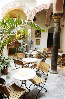 如果你觉得MOCA艺术馆的餐厅还不够有高度,我们推荐宝庆路复兴西路角上的Lapis sky,同样是屋顶餐厅,可以搭乘复古的老式电梯抵达。电梯门一开,出现在眼前的是一家地中海风格的餐厅,一排白色方桌靠着窗户,一侧则是迷你中庭花园,窗户外即是西区的梧桐海洋,那些老洋房的屋顶隐隐约约如岛屿。餐厅一头是迷你露台区,帷幔隔出一二个沙发位,身后花盆有餐厅自种自用的香料花草,可以让她凭味道猜猜看,是罗勒还是迷迭香。
