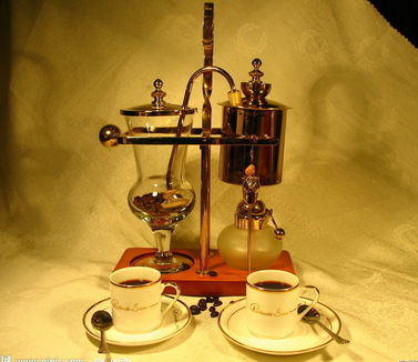 比利时皇家咖啡是雪莉的招牌咖啡,一壶可以供四人饮用,菜单下面的注释里这样写着:欧洲皇家贵族下午茶宴会之高级器具烹煮,纯手工打造。雪莉的咖啡可以以壶来买,用不锈钢的意大利壶煮出来的咖啡,当然比虹吸壶煮的更香醇,而且极浓,有味觉冲击力。每壶有三杯,每杯的平均单价就非常低了,二人或三人喝正好,非常的物超所值。那个比利时咖啡壶,紫铜的密封壶下面有小小的龙头开关,另一边则是玻璃壶,两个壶象天平秤似地架在两边。紫铜壶下面有小小的酒精炉,酒精加热,紫铜壶里的水成了蒸汽慢慢全部进入到玻璃壶中,天枰一边倒向玻璃壶,紫铜壶下面的酒精炉的盖子就会盖上熄灭。一经冷却,咖啡马上就回流到了紫铜壶中,这时将密封阀松开,打开龙头就会有香浓美味的咖啡流出来。煮咖啡的时间帮你控制得十分精确。这种壶都是手工制造,本身就是工艺品。它的价格也就惊人了 ,近万元一个。我正瞪圆了眼睛,经理把旁边同样的一套拿下来放在黑色丝绒台布的咖啡桌上说,这一个是K金的,更贵,是紫铜壶的10倍,九万多元。只卖100元一壶的皇家咖啡就是它们煮出来的?"我问,"是的,客人点了皇家咖啡就会用。"我再次仔细地看了看,那套紫铜壶看得出用得旧了,K金的就崭新得多,不知你有没有机会品尝到这个九万多元咖啡壶煮出来的"皇家咖啡"。