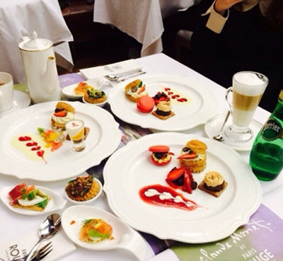 走入Paris Rouge,到过巴黎的人一定会认出这就是经典巴黎咖啡餐厅的风格,餐厅不惜重金只为还原纯正巴黎的氛围,沙发、铜杆、地板、地砖都颇费心思。入门处的马赛克地砖与内里的木质地板自然地将用餐区与咖啡区分开,屋顶由老师傅一笔一划勾绘,还原老上海辉煌时代女青年会大楼的天花,中法合璧,天衣无缝,让人仿佛置身于巴黎,又恍若回到1930年代的摩登上海。在天气晴好的时候,阳光穿过半透明亚光屋顶倾泻下来,整个空间美轮美奂像极了一幅法国油画。除了这份对美与传统的专注之外,Paris Rouge更是坚持出品地道风味的法式甜品与料理,让人们享受优雅环境的同时也得到舌尖上的大大满足。