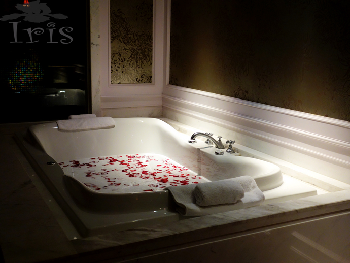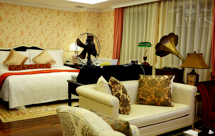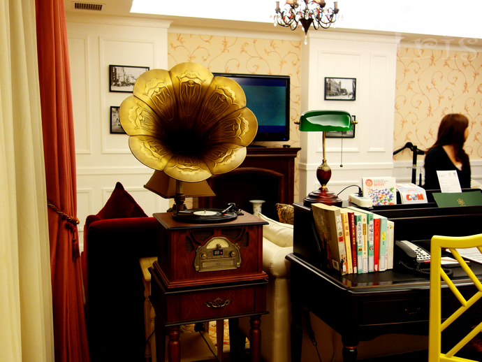 老式留声机、打字机、电风扇、古董瓷器,复古的壁炉和西式浴缸。。。这些具有旧上海滩烙印的元素,仿佛一下就把我们带到了十里洋场的浮华岁月。留声机上还放着唱片,不是摆设,而是真可以使用的。在这种环境下听一曲周旋,那绝对是有穿越的感觉。客房里摆放的欢迎小点,精致得简直舍不得动。奢华便在这一处处细节中慢慢浸出来。