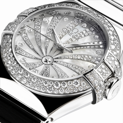 24毫米、27毫米和31毫米的表款分别镶嵌有7.60克拉、8.84克拉和9.06克拉钻石,堪称无与伦比的珠宝珍品。从表盘、表壳、表圈到托爪、表冠和表链,腕表的每一部分的所有表面均优雅铺就有晶莹美钻。 钻石动感魅力第二款欧米茄星座奢华版腕表的部分表链上镶嵌有圆形钻石。表盘上的星徽射线图案营造出视觉动感,其有序延伸出来的完美线条由表盘一直延伸至表壳和表链。