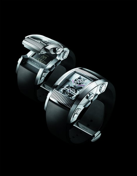 Raptor由年輕設計師Fabrice Gonet設計,18K白金和黑色鈦金屬錶殼,錶徑40x60毫米,另有玫瑰金與黑鈦合金版本,及黑色機板處理之不同版本,各限量33只,防水均達50米。Raptor為雙機芯、雙顯示手錶,第一層錶身內置HD3 FG001陀飛輪機芯,動力儲能100小時;按壓錶側按鈕打開後是第二層機芯,備石英機芯及LCD顯示銀幕,顯示大數字日期、計時碼錶和第二時區顯示。