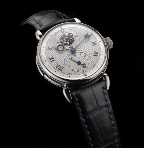 Kari Voutilainen在今年巴塞爾錶展上發表了另一款Masterpiece 7十分鐘三問錶,這是應一位客戶要求而製作的訂作版。Masterpiece 7採用Jaeger LeCoultre的三問機芯為基礎修改而成,面盤的十二點鐘位置備有二十四小時制第二時區顯示。Masterpiece 7的外型和Masterpiece 6類似,錶殼以18K白金製作,直徑同樣是39.5毫米。而金屬護葢上則依顧客要求,由金雕大師Eddy Jaquet雕鏤上Pleiades神話故事裡海神的七個女兒(7 Daughters of Atlas),充分展現量身訂製的不凡體驗。