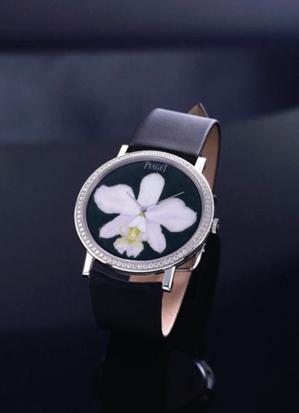 伯爵制430P手动上链超薄机械机芯,18K白金表壳镶嵌78颗美钻,微缩珐琅彩绘朵丽蝶兰图案面盘,银色巴顿指针。