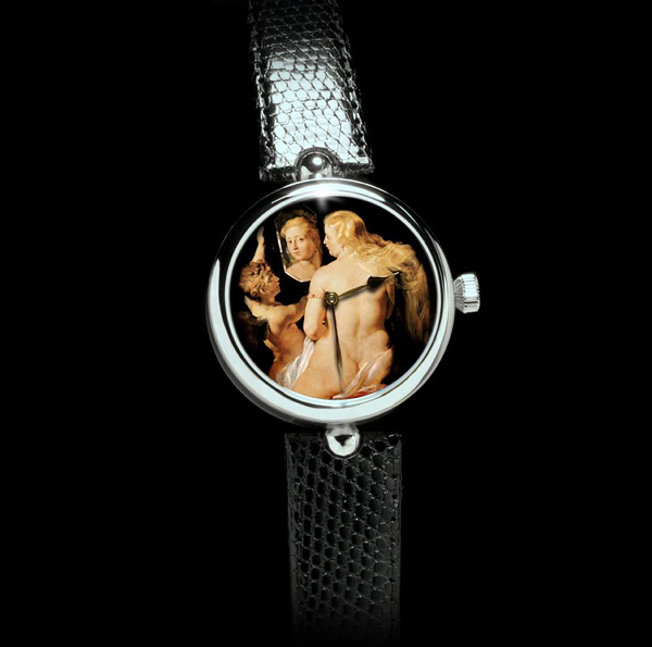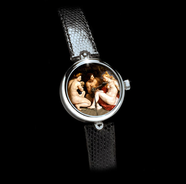 瑞士豪华手表制造商角动量已发布,寓言和神话的所谓新工匠钟表展以“Verre ?glomisé的”微型画拨打扭转玻璃。 袖珍画后,荷兰巴洛克画家的作品。 这些豪华手表表盘玻璃镜面不锈钢表壳与抛光圆形挡板,并打磨“布勒在12日和6时,机械自动上弦运动”鸡眼,羽手中。所有腕表都是独一无二的豪华作品。