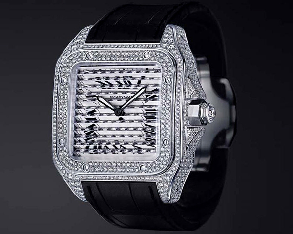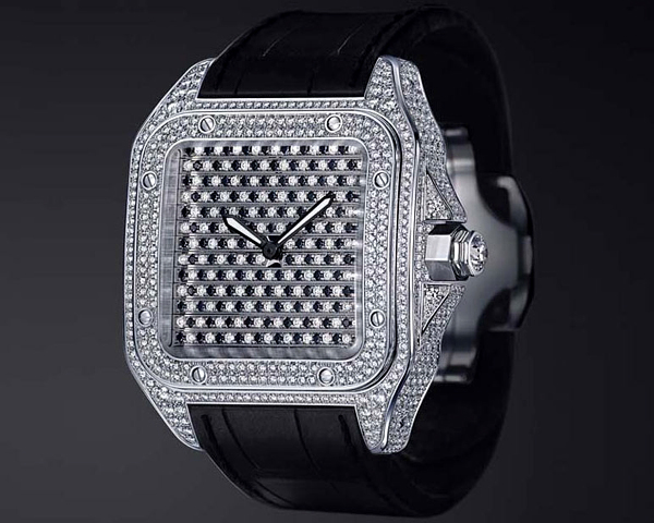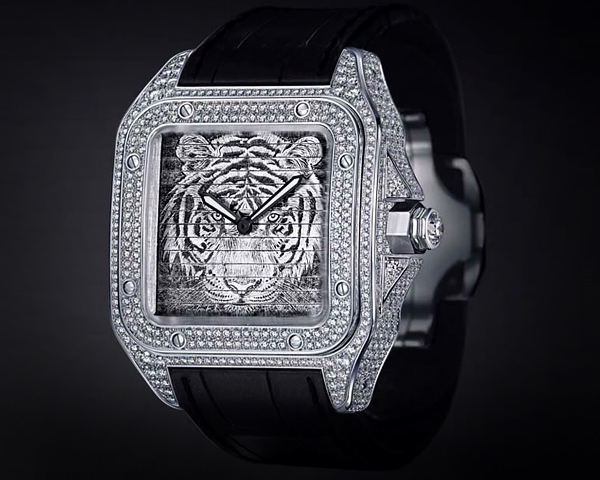 新的卡地亚 -男人的珠宝商卡地亚手表桑托斯三重100 -珠宝手表的最严重的类声明中。 在案件制作的18K白金宝石是一套完全符合。 钻石的总人数是861,其重量 - 7,6克拉。 然而,卡地亚桑托斯三重100的主要特征是一个可移动的拨号,在窗帘的原则设计的:把一个三角形绕组冠驾驶部分。 因此,同样的手表表盘有三个不同的面孔:第一面是用钻石和黑色蓝宝石覆盖,第二面刻有一只老虎的头,而第三个是一个典型的脸,12罗马数字完成。这些高档手表将在仅限量20份。 价格大约是34万美元。