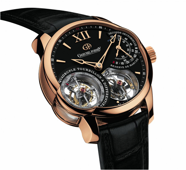 翻两番陀飞轮Greubel福西奠定了艺术与科技创新。 这个惊人的组成独立的四个tourbillons有助于其特殊计时性能。 案例是由18K金红金与非对称凸蓝宝石晶体。