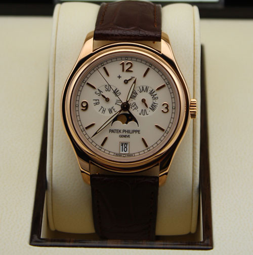 点评:于2005年推出的加大年历系列,除了铂金,白金和黄金之外,又增添了玫瑰金款式。这个款式是PP最热门的款式了,也是PP入门级别的复杂款正装表。