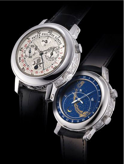 点评:常用的复杂功能,它有具飞返日历指针的万年历、月龄、三问以及陀飞轮。至于不常见的天文指示,则有星象图、恒星时间、月相图以及月亮轨迹。完美无瑕的做工与装饰,将这一代极品赋予一流以上的艺术气质。此表拥有日内瓦印记以及复杂表种不常有的天文台表设书,在多功能的同时强调了质的重要。它装备686件独立零件,每年最多只可以做两支。