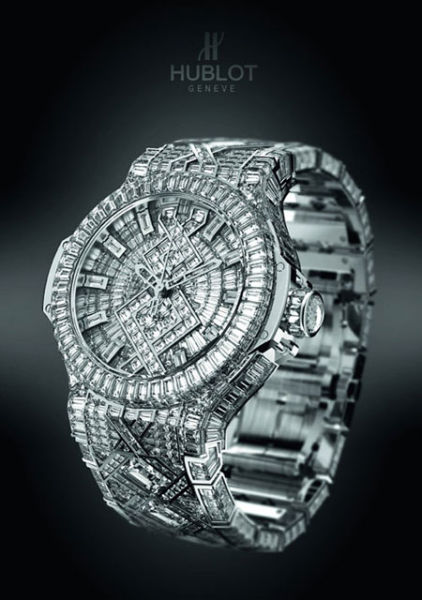 如果说积家在表圈镶一周精致小钻的做法是开胃小菜,那这枚宇舶500万美元全钻腕表可谓是豪华大菜。全球首创的旷世臻品,独一无二的惊艳之作以及前所未有的创意!其高调的“嚣张”之美独领今年钻表风骚,通体由总重量超过100克拉的1282颗方型钻石组成,全球仅有一枚。