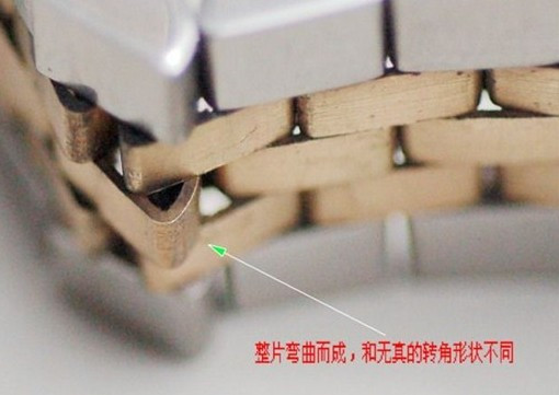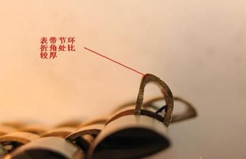 以下文字引王向明语:18K金表带的每一节的工艺都非常特殊,从它的截面上看,在折弯处比较厚,也就是说,它的厚度并不是均匀的。这个工艺假表可做不了,因此,所有的这类假劳力士手表,它每一节K金的表带节的环厚度都是一样的。在看的时候需要把表带折成90度角,好让表带节环的折角部位露出来才行。