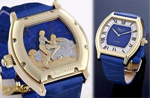 该款春宫表仅此一支,采用18K黄金打造表壳,表盘及表底壳为艳蓝色洒金的青金石。写实风格的人偶由黄金和白金雕成,而春宫地点是蓝色星空下的超级跑车后备箱,这是对现代情趣方式的完美刻画和直白诠释。