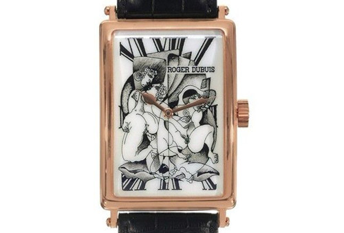 罗杰杜彼Roger Dubuis全球限量28支的“Much More – Cerotique”春宫腕表独辟蹊径,采用毕加索开创的立体主义,通过碎裂、解析和重新组合的方式隐晦地表现出三人云雨的激情场面,直接把春宫场面放置在盘面上。