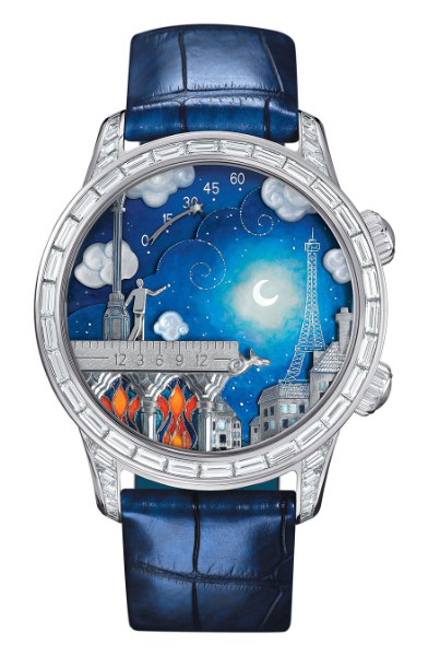 仅需触动按钮,手表就会整点报时、一刻钟报时和分钟报时,并设置了美妙的动画序列动作。通过两圈卷盘机制会产生大教堂圆润的钟声和共鸣,与之相称的是金质表壳上复杂的钟乐系统,表壳直径47毫米,仅厚18.4毫米。