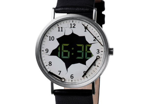 美国设计师Ross McBride这个“Digital Destruction Watch”的设计转换了一种思路,有一种翻新感,里面的镜面看似破碎,但借以周边支离的纹路,反而凸显了时间的易逝,别具一格。设计联