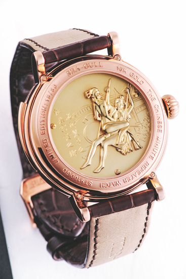玫瑰金金瓶梅活动人偶三问表这款集成三问和活动人偶的复杂款体现出国产表的制表工艺同样技术精湛。表背面的活动人偶随报时动作,经典再现《金瓶梅》中描绘的西门庆和潘金莲性爱秋千场景。
