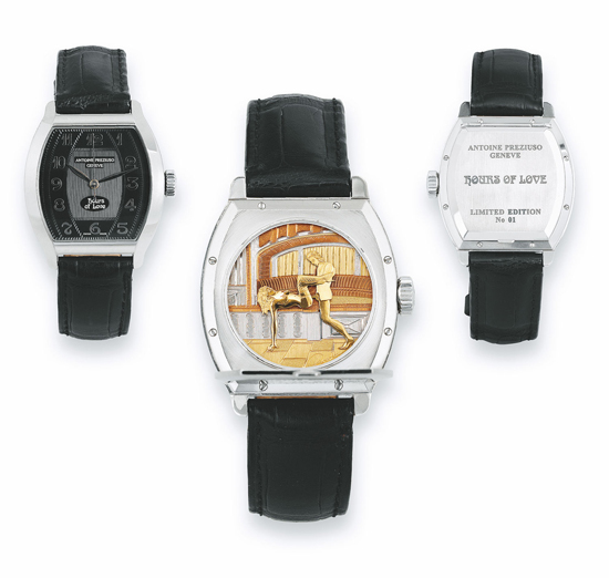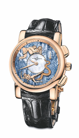 伊甸园活动人偶春宫自鸣报问表瑞士雅典表将旧约圣经《创世纪》中的亚当与夏娃搬上表面,当报时机制启动时,面盘12点钟位置的亚当与夏娃则会随着报时音卖力“偷尝禁果”,6点钟位置的蛇舞动身躯企图引诱夏娃犯罪。