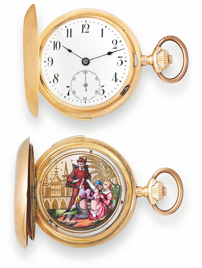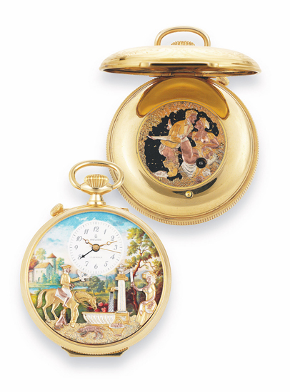 从表面上来看,这无非就是一只融合了雕刻的珐琅彩绘作品,盘面上的情景或静谧或安逸,总之无论怎样都不会让把玩者有任何“非分之想”。不过,当掀开表的后盖,看到直白的春宫画面时,再联想一下前面的情景,让人不由得浮想联翩起来。