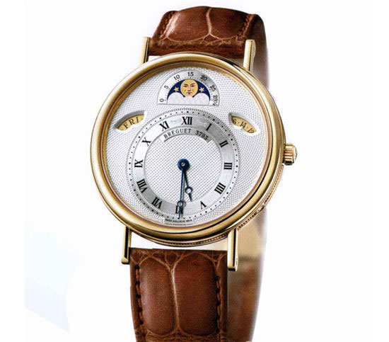 宝玑于2009年时推出的Classique黄金月相手表,展现了月相钟表中最为古老的设计模式。半圆式的月相显示盘以及月亮表面上所雕琢的笑脸图案,如今已甚少为普通月相表所采用,这一极具感性气质的设计取向在于通过满月时笑脸的完全展露,为佩戴者传达一种简单而愉悦的观感。此外,对于月相盘中云朵所加以的波纹状雕琢,以及月亮左右诠释斗转星移这一唯美意境的星团,均显现出了宝玑注重细节的设计品位。
