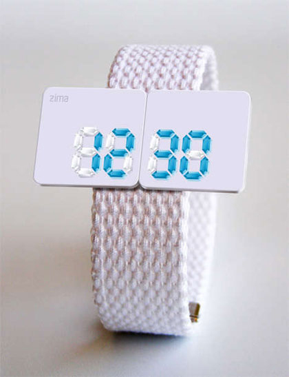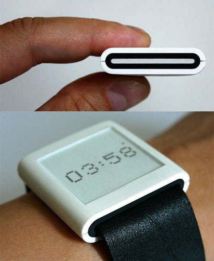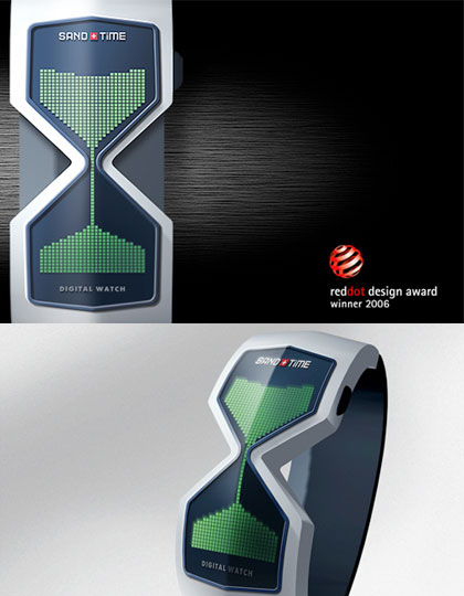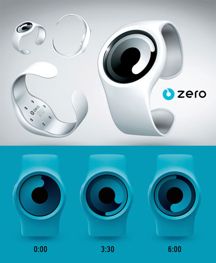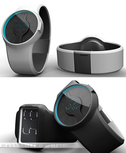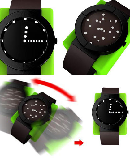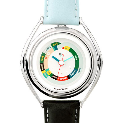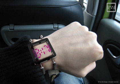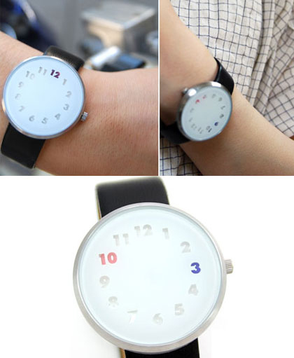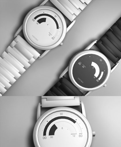 貌似仪表盘的手表设计,上面的弧形显示分针,下面的弧度显示时针。
