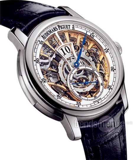 在复杂功能领域屡有建树的爱彼表的这枚三问表非常精致,缘于除了三问之外,整个表盘的全镂空设计让人不由屏气凝神于技师的高超手艺。而且如果你留神,会发现跳时的12个数字印在独立的透明盘面上,通体的镂空让你轻而易举洞悉内部的机械运作,这哪里是表,分明就是艺术品。