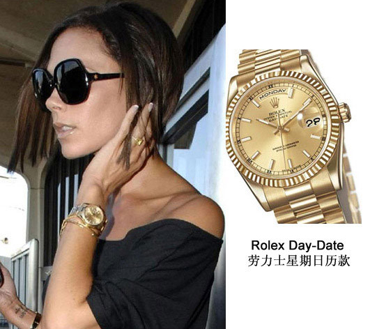 1956年问世的劳力士蚝式恒动星期日历型手表(DAY-DATE)是世界上首款能够显示完整星期拼写的手表。星期显示位于12点正中的位置,说明了它的重要性,备有26种语言供选择,覆盖了全球绝大多数国家和地区。其沉稳、厚重的外观至今仍不过时,也为后世的DAY-DATE表提供了范本。这个系列有多种材质的款式,贝嫂的这款纯金的价格在20万至30万人民之间。
