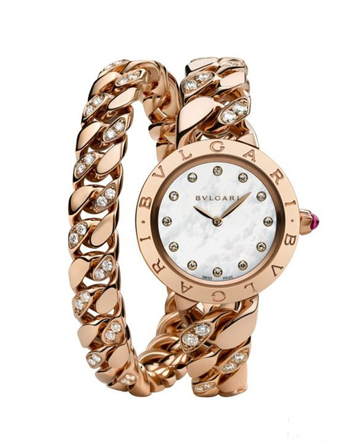 全新 Catene 女士腕表的表链由 18K 玫瑰金链相互交织,看似简单,实则非常复杂。众多的链环构成这件以传统珠宝与金工技术为基础的复杂表链,应用的18K玫瑰金重达41克。18K玫瑰金表壳、刻着双品牌标志的表圈以及镶嵌着明亮式切割钻石(0.133 克拉)的珍珠贝母表盘组成了这款珍贵的腕表。