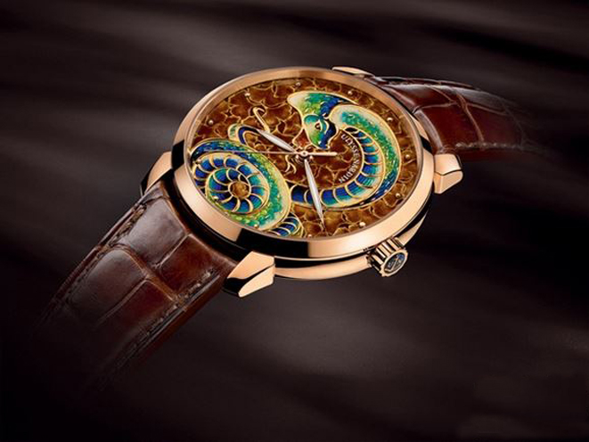 雅典全新鎏金填彩珐琅灵蛇腕表采用直径40毫米18K玫瑰金表壳,搭配抗磨损蓝宝石水晶玻璃表镜和防水表冠。精致表盘绘有美观珐琅图案。工匠先运用填彩珐琅工艺(champlevé)的方法,在表盘上直接用凿子雕刻出需要上色的区域,然后填上玻璃珐琅,不同金属的氧化物可提炼成不同颜色。表盘再经过高温烘烤令珐琅融化,待珐琅表面冷却后,加以抛光便得以完成。完成后,表盘呈现出一幅壮观图案:一条巨蛇悄悄从茂密的枝叶上冒出,蓄势待发的姿态,为攻击作好准备。它张牙吐舌,露出毒牙,蜷着尾巴稳定身体,蓝色和绿色宝石色调在蛇皮上跳动着。