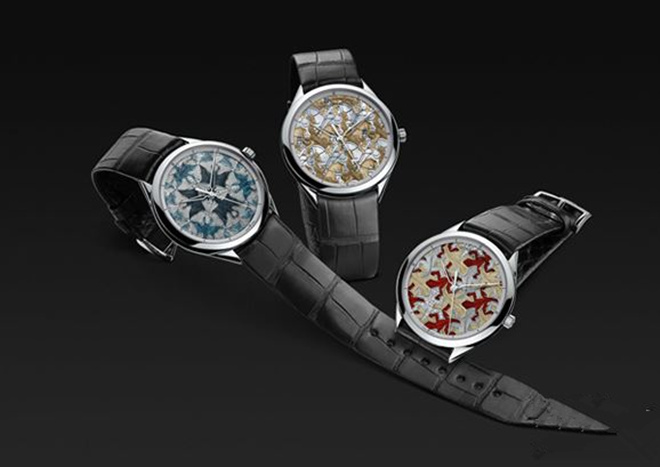 表盘上的红色和棕色蜥蜴或以宝石镶嵌,或泛着淡淡银光,栩栩如生,优美迷人。腕表从这位荷兰艺术家的版画《蜥蜴》中获得灵感,糅合四种古老的装饰工艺,画面表现惟妙惟肖,宛然在目。