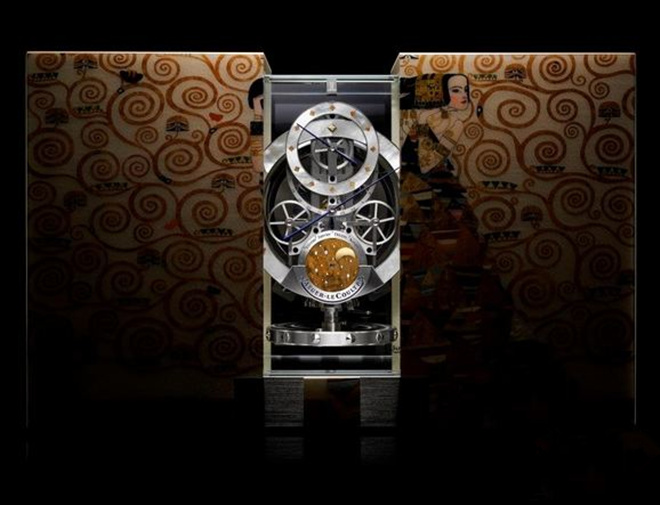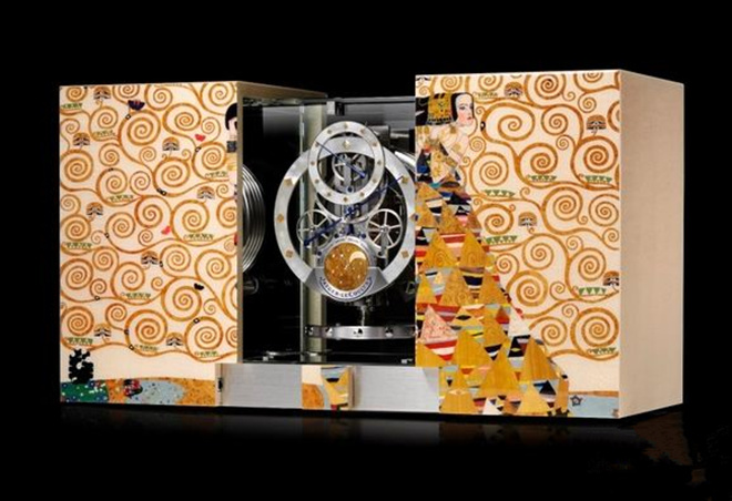 Atmos 空气钟系列的第五款杰作,为向古斯塔夫·克林姆(Gustav Klimt)致敬而问世,其灵感源自这位奥地利艺术家于1905 年为装饰斯托克雷特宫(Palais Stoclet) 而创作的壁画作品《等待》(L’Attente),这座私人宅邸由一位布鲁塞尔金融家建造。