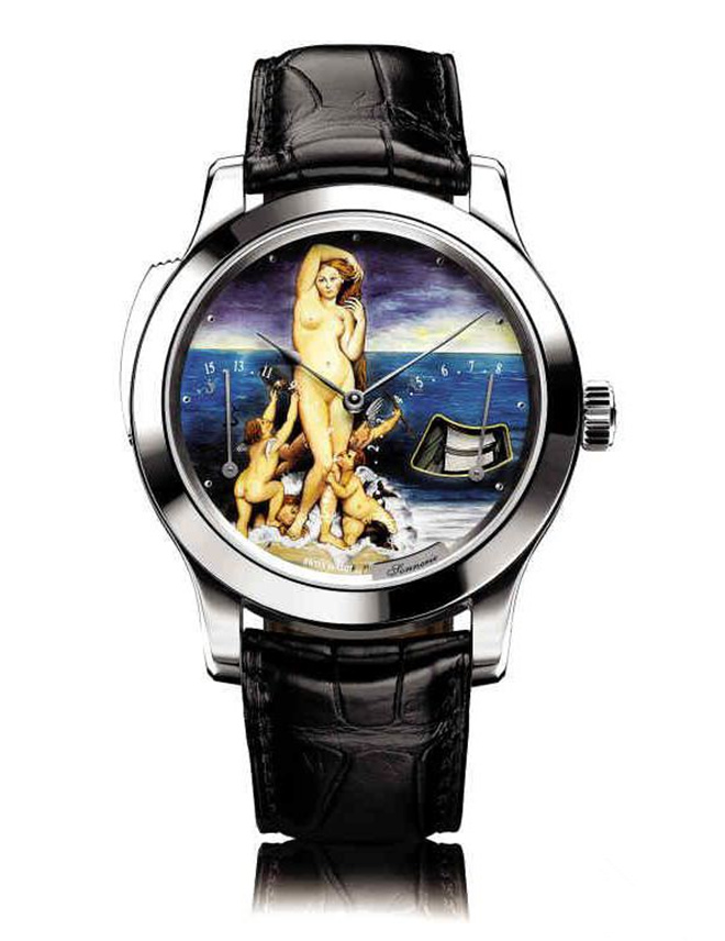 积家维纳斯珐琅彩绘腕表,选择了波提切利的“维纳斯的诞生”、提香的“乌尔比诺的维纳斯”、韦拉斯克斯的“镜前的维纳斯”和安格尔的“海中升起的维纳斯”四幅名画,配以三问腕表,价值在200万-400万元人民币之间。