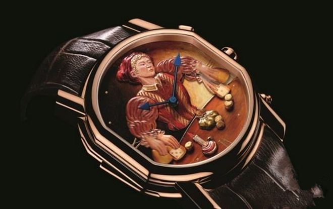整款腕表的创作灵感源自Caravaggio在16世纪创作的画作《赌博》,在表盘之上打造了骰子玩家的形象。腕表的精湛之处在于它是一个由机械及以分钟间报时激活控制的复杂机件组合体,华丽地诠释了微型机件设计的复杂性。