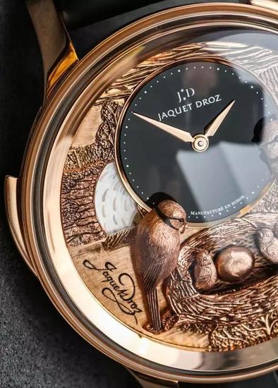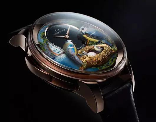 与此同时,瑞士名表雅克德罗又将这一技艺由视觉推向听觉。雅克德罗本人喜欢研究十八世纪欧洲流行的自动装置,取材于大自然的鸟类,他造出了许多有趣的怀表和鼻烟盒;而那些会唱会跳的小鸟自然成了这些装置最突出的特点。为了对雅克德罗这种特殊的爱好表达敬意,公司推出了一系列珐琅绘制小鸟腕表,底下的活塞鸣笛装置一旦被启动,镶嵌在玻璃球中的小鸟便会开始唱唱跳跳。