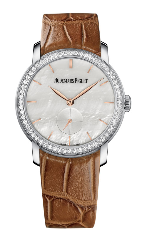 表盘:白金表盘镶嵌深具“扩张”效应的美钻、2N成色金质抛光钻石刻面蓝钢指针。