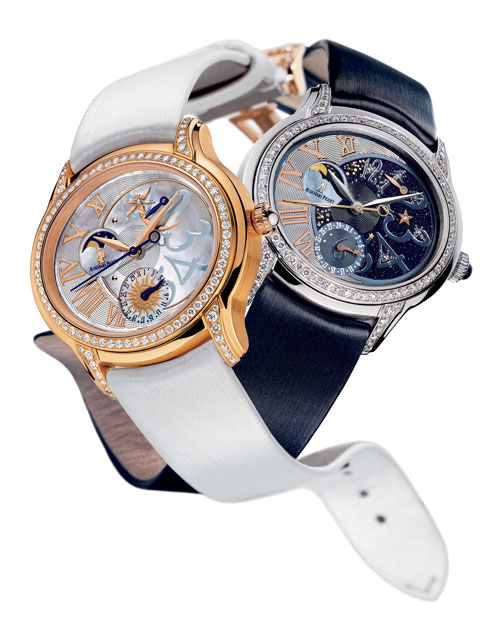特点:爱彼千禧星空系列共分两款,分别献礼星夜与白昼,以诗情画意的方式,提醒人们时间的节奏主要来自天际的繁星。星夜版以五枚星光闪耀的镶钻明星刻度,辉映着优美的蓝色大型阿拉伯数字时标。表面左侧是镶贴白色珍珠母贝或镶钻的一弯新月,上有罗马数字时标,散发月牙般的火红光晕。白昼版则以天然珍珠母贝圆满的光华取代夜空与新月,一颗光芒四射的艳阳盘在日期显示盘的中央。寄情日月星辰,共言浪漫絮语,爱彼千禧星空腕表,只为心中独一无二的珍贵爱人打造。