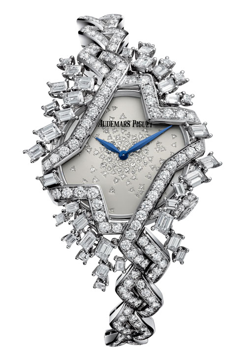 特点:源自侏罗山谷的爱彼高级珠宝腕表以大自然为主角,由一队技艺超群的设计师、宝石镶嵌师、雕刻师以及制表师携手合作完成。品牌从浩瀚宇宙中汲取灵感,以449颗美钻点缀最新的艺术杰作,通过非对称与对称线条的应用,巧妙融合了新艺术浪潮的自由风格与装饰艺术的几何架构,别具一格。其整个圆形表盘犹如柔和的天际背景,烘托着一颗颗闪耀的星辰,在表盘外围接续运转。为增添动感,表壳垂挂着长阶梯形切割钻石吊饰,以随佩戴者的摆动而摇曳生姿。