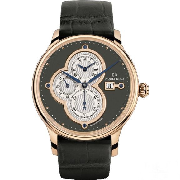 该腕表表壳直径42毫米,表盘上位于12时位置的偏心时分针盘以及24小时显示盘显示的是第二时区时间,而本地时间则凭借中央时针和分针显示。秒针盘的位置设计仍然忠实于雅克德罗的传统,设于6时位置。
