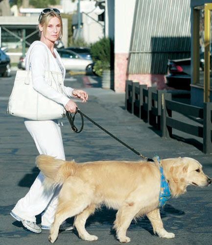 Nicollette Sheridan纯白的运动装扮搭配上同样白的大包包,轻松的溜狗休闲也能穿出品位,百搭的白色包真的是每个女人衣柜里不可少的。