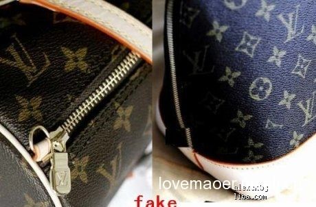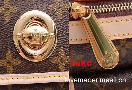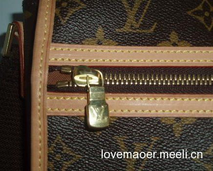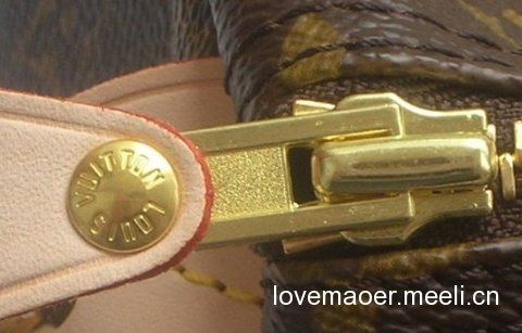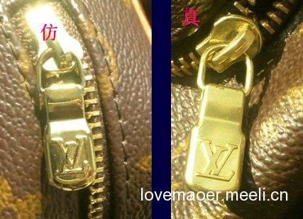3。从五金件上识别,通常LV专柜真品的五金,比如拉链头,通常不会是很亮的金黄色,而是青金铜色,感觉不是特别亮,有的会是稍暗的,有点近似磨砂的质感,但又没到磨砂的程度,总之很有质感的感觉。当然也不能一概而论哦,现在不少新款的五金件也有不少是很亮的颜色。这里只说说最普通的老花老款常规包而言。下面以超A拉链头为例,图示一下两者差别。不用吃惊,特别闪,特别亮的左图的仿的,虽然颜色已经相当不错,很接近超A卖家标榜的真品的青金铜色了,但还是太亮了些。而右图有点乌的是真的。有可能照片光线的关系,实物也没那么重的磨砂感觉,还是有一定光亮度的,但不是象左图那种很贼的亮。最大差别在于上面的LV字样,真品比较立体,且整齐,边缘比较棱角分别,而仿品除了比较贼亮以外,LV浮雕出来的感觉过于圆滑,不够分明。