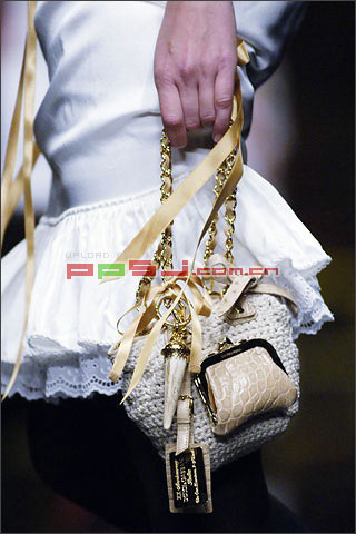 白色编结材质多了轻盈的透气感,随意系扎的丝带跟随微风轻轻舞动,小巧轻巧的手袋最适合展现春天的灵动。