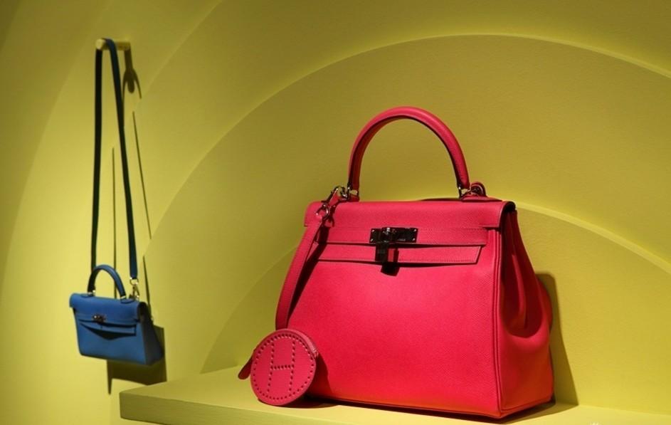 圖為藍色迷你Kelly包、28寸玫紅色Epsom 牛皮Kelly手提包。