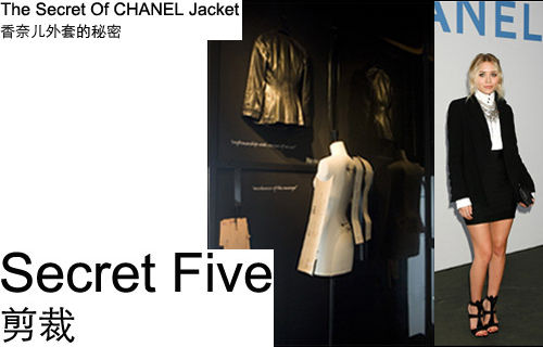 一件香奈儿外套内外的裁片可能多达50 余片,每个裁片均预留缝份可以放大或缩小约一个尺吋,以备修改。有些由质轻的斜纹织物制作的外套,每隔几公分就用针密缝在一起,以维持形状及确保舒适。这就是香奈儿知名的覆盖缝(over stitch)。多裁片缝制的外套如针织毛衣般舒服,不论是在身体行进或静止不动时,都能自动调回正确的位置,维持完美的优雅体态。