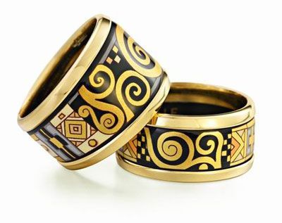 造型独具匠心的新款18k金系列中精美珐琅的运用与18k金的闪亮镶边让对戒独具特色。
